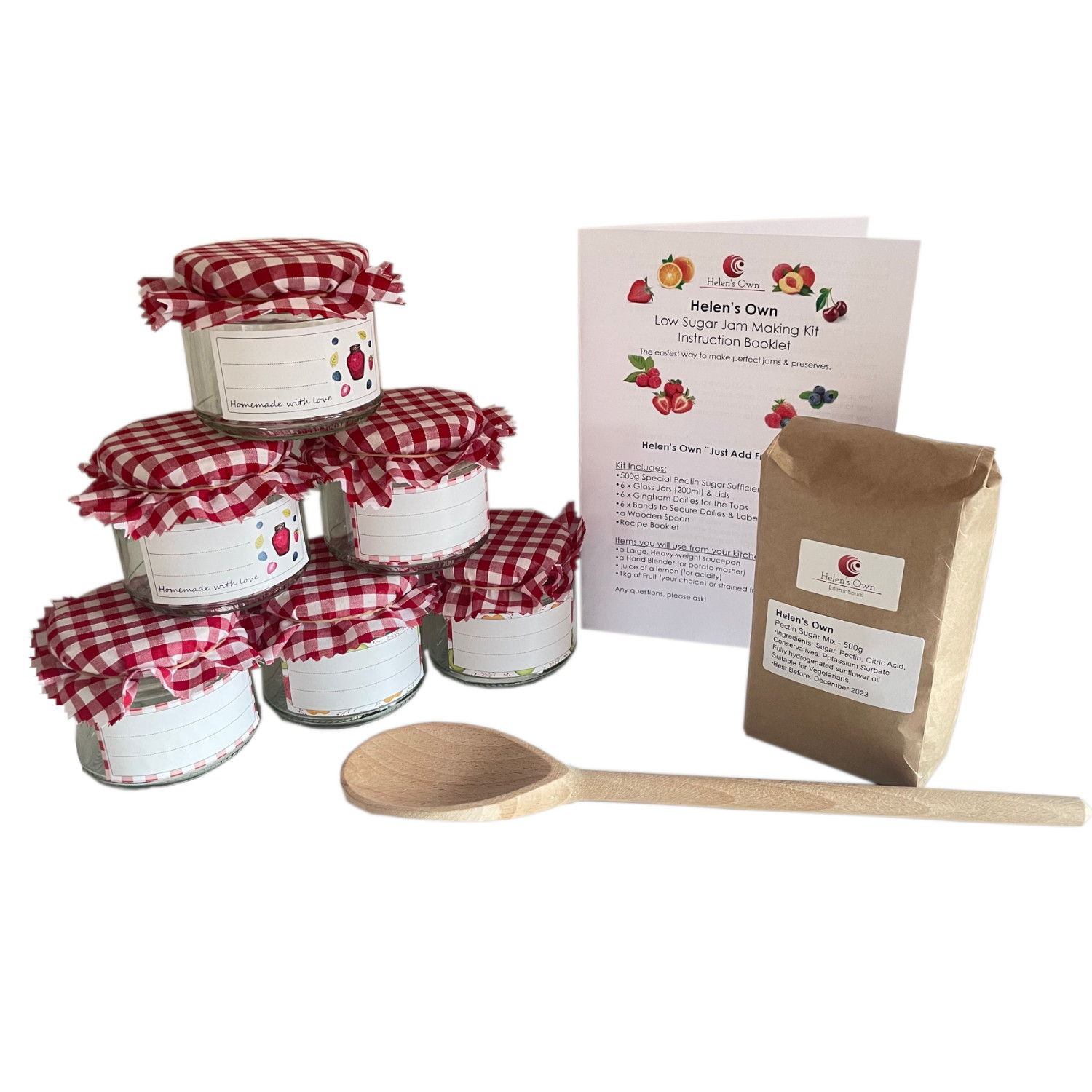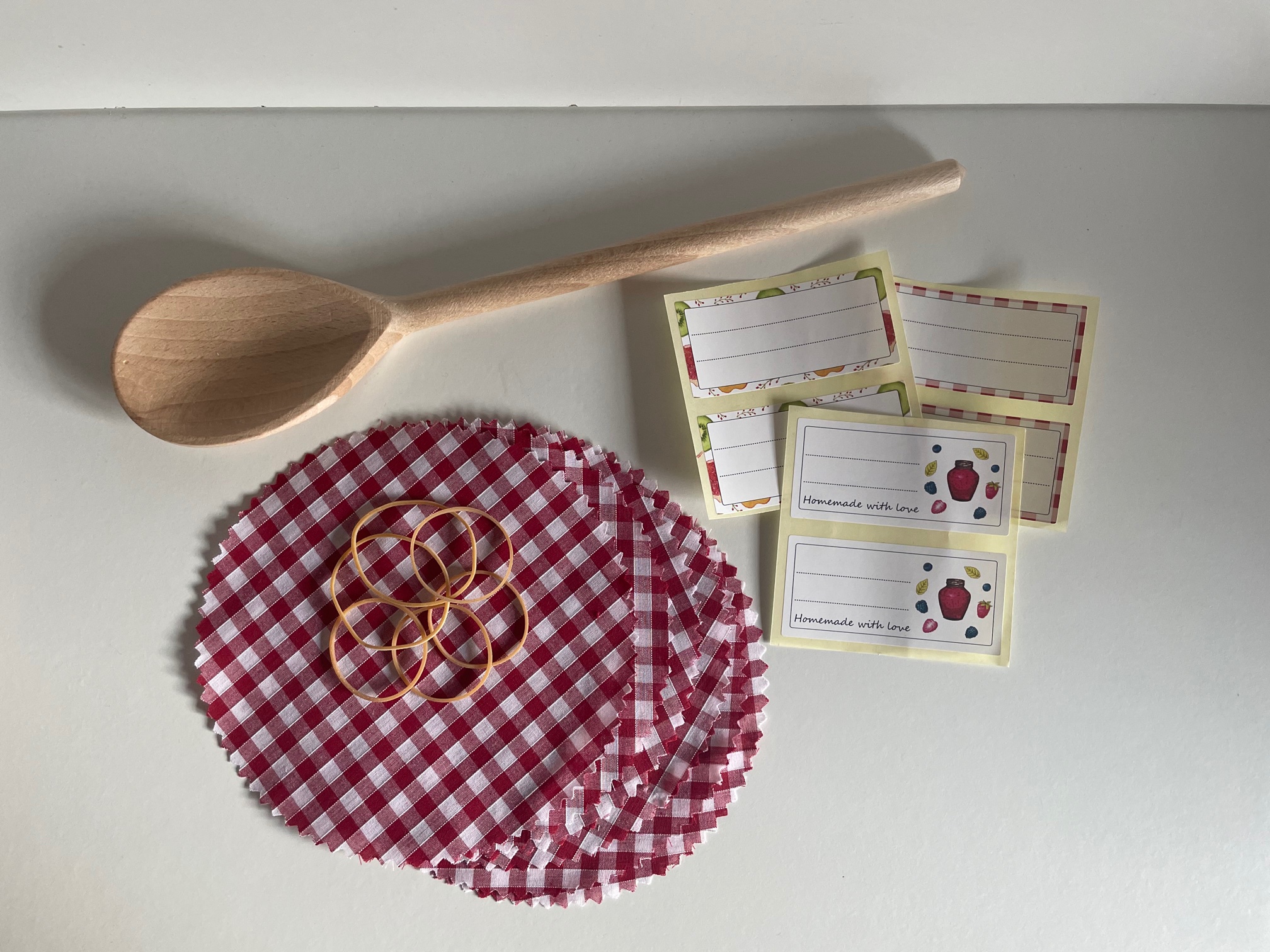 Just follow the simple instructions and you don’t need to worry about whether it will set. No need for complicated thermometers or testing! There are 6 x 200 ml jars included in the kit together with gingham check doilies to cover the lids, rubber bands to secure and labels to write on. I’m even including a wooden spoon!